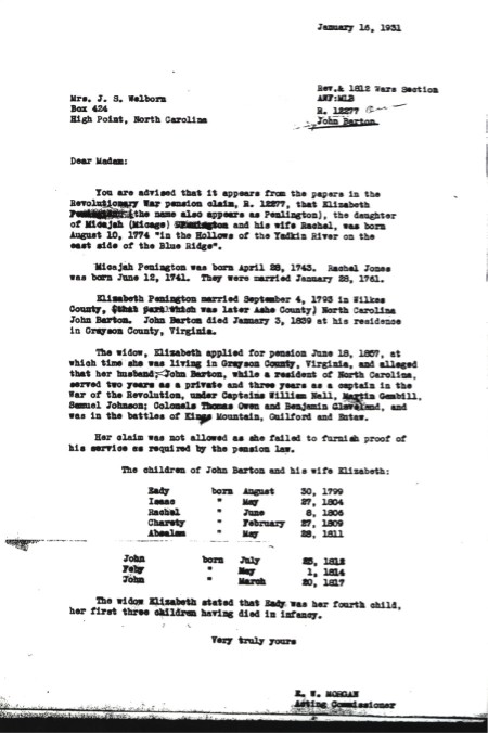 son John Wesley Pennington. Daniel's line is Daniel>Levi>Micajah.
